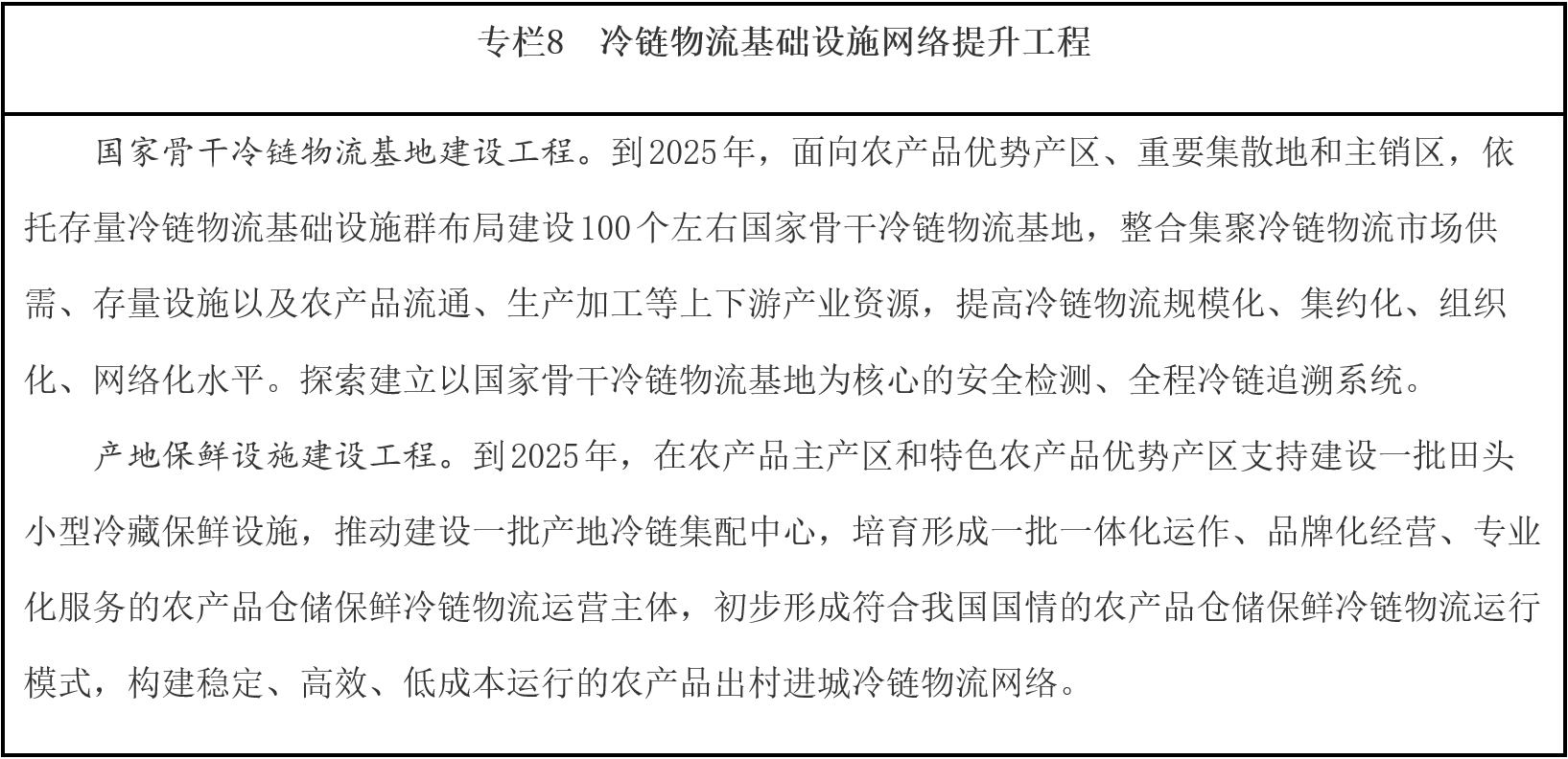 提高冷鏈物流質(zhì)量效率。大力發(fā)展鐵路冷鏈運(yùn)輸和集裝箱公鐵水聯(lián)運(yùn),對(duì)接主要農(nóng)產(chǎn)品產(chǎn)區(qū)和集散地,創(chuàng)新冷鏈物流干支銜接模式。發(fā)展“生鮮電商+產(chǎn)地直發(fā)”等冷鏈物流新業(yè)態(tài)新模式。推廣蓄冷箱、保溫箱等單元化冷鏈載器具和標(biāo)準(zhǔn)化冷藏車,促進(jìn)冷鏈物流信息互聯(lián)互通,提高冷鏈物流規(guī)?;?、標(biāo)準(zhǔn)化水平。依托國(guó)家骨干冷鏈物流基地、產(chǎn)銷冷鏈集配中心等大型冷鏈物流設(shè)施,加強(qiáng)生鮮農(nóng)產(chǎn)品檢驗(yàn)檢疫、農(nóng)獸藥殘留及防腐劑、保鮮劑、添加劑合規(guī)使用等質(zhì)量監(jiān)管。研究推廣應(yīng)用冷鏈道路運(yùn)輸電子運(yùn)單,加強(qiáng)產(chǎn)品溯源和全程溫濕度監(jiān)控,將源頭至終端的冷鏈物流全鏈條納入監(jiān)管范圍,提升冷鏈物流質(zhì)量保障水平。健全進(jìn)口冷鏈?zhǔn)称窓z驗(yàn)檢疫制度,筑牢疫情外防輸入防線。