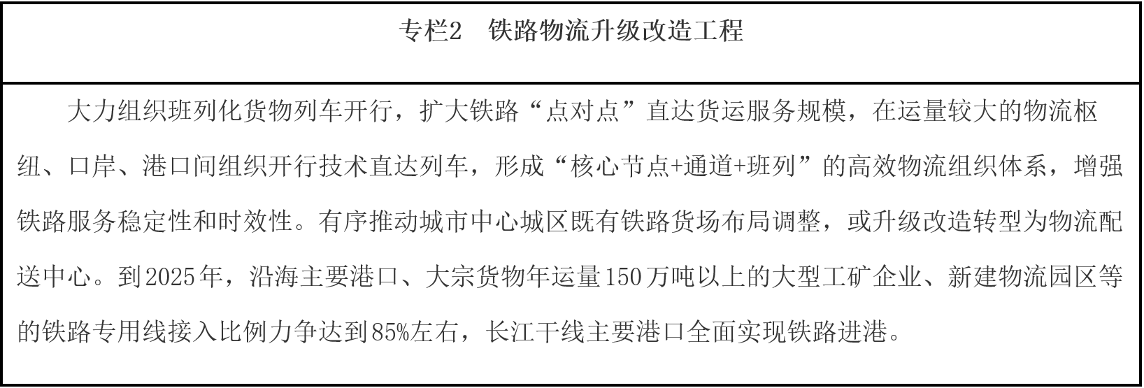 推進(jìn)結(jié)構(gòu)性降成本。加快推進(jìn)鐵路專用線進(jìn)港區(qū)、連園區(qū)、接廠區(qū),合理有序推進(jìn)大宗商品等中長(zhǎng)距離運(yùn)輸“公轉(zhuǎn)鐵”、“公轉(zhuǎn)水”。完善集裝箱公鐵聯(lián)運(yùn)銜接設(shè)施,鼓勵(lì)發(fā)展集拼集運(yùn)、模塊化運(yùn)輸、“散改集”等組織模式,發(fā)揮鐵路干線運(yùn)輸成本低和公路網(wǎng)絡(luò)靈活優(yōu)勢(shì),培育有競(jìng)爭(zhēng)力的“門到門”公鐵聯(lián)運(yùn)服務(wù)模式,降低公鐵聯(lián)運(yùn)全程物流成本。統(tǒng)籌沿海港口綜合利用,提升大型港口基礎(chǔ)設(shè)施服務(wù)能力,提高碼頭現(xiàn)代化專業(yè)化規(guī)?;?,加快推進(jìn)鐵水聯(lián)運(yùn)銜接場(chǎng)站改造,提高港口鐵路專用線集疏網(wǎng)絡(luò)效能,優(yōu)化作業(yè)流程。完善內(nèi)河水運(yùn)網(wǎng)絡(luò),統(tǒng)籌江海直達(dá)、江海聯(lián)運(yùn)發(fā)展,發(fā)揮近海航線、長(zhǎng)江水道、珠江水道等水運(yùn)效能,穩(wěn)步推進(jìn)貨物運(yùn)輸“公轉(zhuǎn)水”。推進(jìn)鐵水聯(lián)運(yùn)業(yè)務(wù)單證電子化,促進(jìn)鐵路、港口信息互聯(lián),實(shí)現(xiàn)鐵路現(xiàn)車、裝卸車、貨物在途、到達(dá)預(yù)確報(bào)以及港口裝卸、貨物堆存、船舶進(jìn)出港、船期艙位預(yù)定等鐵水聯(lián)運(yùn)信息交換共享。支持港口、鐵路場(chǎng)站加快完善集疏運(yùn)油氣管網(wǎng),有效對(duì)接石化等產(chǎn)業(yè)布局,提高管道運(yùn)輸比例。