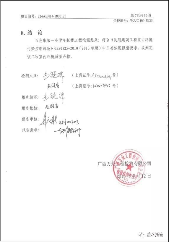 2??018927日,廣西萬眾工程檢測有限公司提交了檢測報告,新托管樓室內(nèi)、室外檢測點甲醛、氨、苯、TVOC、氡濃度指標(biāo)均符合《民用建筑工程室內(nèi)環(huán)境污染控制規(guī)范》GB50325-20102013年版)中I類濃度限量要求,室內(nèi)環(huán)境質(zhì)量合格。