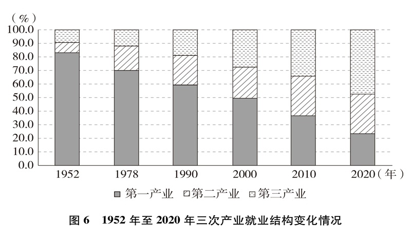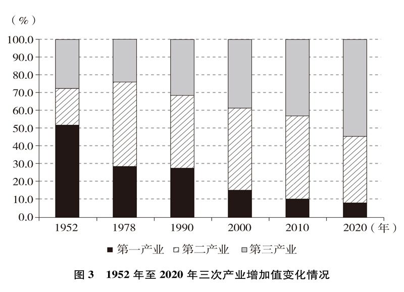 產(chǎn)業(yè)結(jié)構(gòu)優(yōu)化升級。中國已建成世界上最完整的產(chǎn)業(yè)體系,產(chǎn)業(yè)發(fā)展持續(xù)向中高端邁進。三次產(chǎn)業(yè)增加值之比從1952年的50.5∶20.8∶28.7到2020年的7.7∶37.8∶54.5,中國從傳統(tǒng)農(nóng)業(yè)大國成為工業(yè)大國、服務(wù)業(yè)大國(圖3),中國經(jīng)濟從依賴單一產(chǎn)業(yè)為主轉(zhuǎn)向依靠三次產(chǎn)業(yè)共同帶動。農(nóng)業(yè)現(xiàn)代化成效顯著,機械化、數(shù)字化、綠色化、功能化、共享化水平明顯提高,廣大農(nóng)民逐步告別“面朝黃土背朝天、一身力氣百身汗”的辛勞,農(nóng)村生產(chǎn)力極大解放;糧食生產(chǎn)能力穩(wěn)步提升,實現(xiàn)谷物基本自給,中國人把飯碗牢牢端在自己手中。中國建成門類齊全、獨立完整的現(xiàn)代工業(yè)體系,工業(yè)化和信息化融合發(fā)展的廣度和深度不斷拓展,“中國制造”向“中國智造”轉(zhuǎn)型升級,產(chǎn)業(yè)鏈供應(yīng)鏈現(xiàn)代化水平進一步提升。以新一代信息技術(shù)、生物技術(shù)、高端裝備、綠色環(huán)保為代表的戰(zhàn)略性新興產(chǎn)業(yè)發(fā)展迅速,成為引領(lǐng)高質(zhì)量發(fā)展的重要引擎。數(shù)字經(jīng)濟激發(fā)經(jīng)濟發(fā)展新活力,產(chǎn)業(yè)數(shù)字化和數(shù)字產(chǎn)業(yè)化趨勢加快?,F(xiàn)代服務(wù)業(yè)加速發(fā)展,以“互聯(lián)網(wǎng)+”為標(biāo)志的新業(yè)態(tài)、新模式層出不窮,平臺經(jīng)濟、共享經(jīng)濟蓬勃興起,生產(chǎn)性服務(wù)業(yè)向?qū)I(yè)化和高端化發(fā)展,生活性服務(wù)業(yè)向精細化和高品質(zhì)轉(zhuǎn)變。產(chǎn)業(yè)結(jié)構(gòu)的優(yōu)化升級促進了經(jīng)濟更加均衡、更加充分的發(fā)展,人們個性化品質(zhì)化多樣化需求不斷得到滿足。