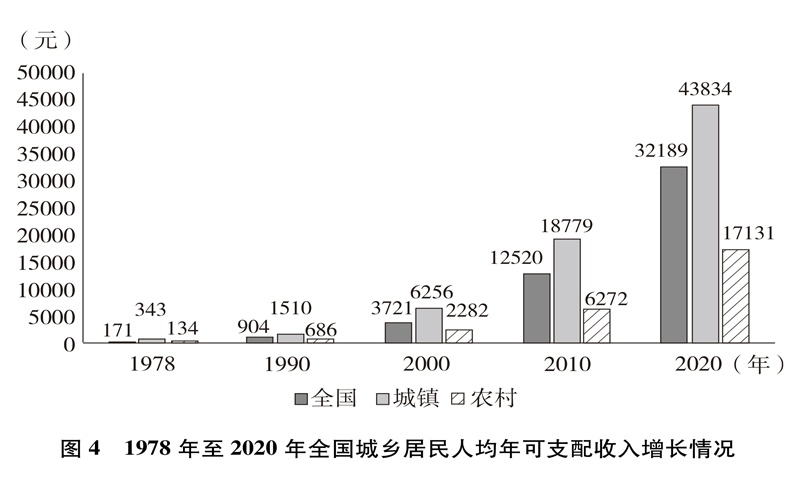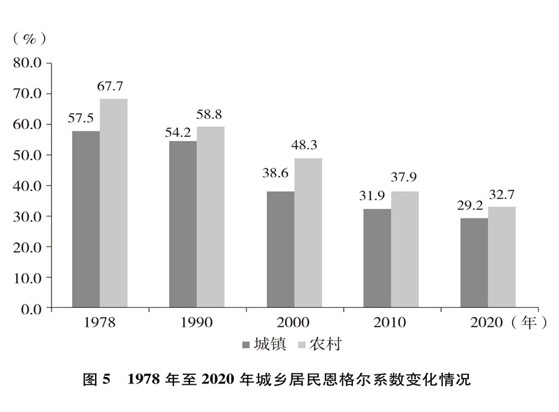 人民生活水平顯著提高。居民收入持續(xù)增加,全國居民人均年可支配收入從1978年的171元增加到2020年的32189元(圖4)。城鄉(xiāng)居民恩格爾系數(shù)分別從1978年的57.5%、67.7%下降到2020年的29.2%、32.7%(圖5),城鄉(xiāng)居民生活質(zhì)量不斷提升。溫飽問題解決后,人們對生活品質(zhì)、品位有了更高的追求,衣食住行不斷升級,消費結(jié)構(gòu)從生存型逐漸向發(fā)展型、享受型過渡。衣,從穿暖到穿美、穿出時尚;食,從吃飽到吃好、吃出健康;住,從有所居到更敞亮、更宜居;行,從便利通暢到快捷舒適。吃穿用有余,家電全面普及,乘用汽車快速進入尋常百姓家。餐飲、健康、教育、旅游、文娛等服務(wù)性消費持續(xù)快速增長,在居民人均消費支出中占比逐漸達到一半左右。越來越多的人有“錢”有“閑”,“詩和遠方”更加觸手可及,“說走就走”不再是夢想,旅游扮靚人們的幸福生活,中國正在進入大眾旅游時代。