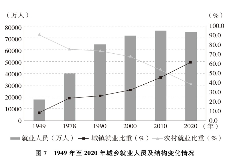 就業(yè)局勢長期穩(wěn)定,就業(yè)質(zhì)量顯著提升。就業(yè)人數(shù)從1949年的1.8億增加到2020年的7.5億,就業(yè)規(guī)模不斷擴大;從絕大多數(shù)勞動者以農(nóng)業(yè)為生到第三產(chǎn)業(yè)就業(yè)人數(shù)占47.7%(圖6)、城鎮(zhèn)就業(yè)人數(shù)占61.6%(圖7),就業(yè)結(jié)構(gòu)不斷優(yōu)化;從勞動者普遍處于文盲半文盲狀態(tài)到勞動年齡人口平均受教育年限10.8年、技能人才總量約2億,就業(yè)人員素質(zhì)大幅提高。億萬勞動者擁有自己熱愛的工作,開啟幸福生活的大門。從計劃分配到市場就業(yè)、自由擇業(yè)、自主創(chuàng)業(yè),從傳統(tǒng)就業(yè)方式到新就業(yè)形態(tài),勞動者的就業(yè)觀念深刻變革、就業(yè)空間更加廣闊、就業(yè)方式日益多元。人們的興趣愛好、特長稟賦與個人就業(yè)意愿、社會需求、國家需要更好結(jié)合,自我價值更好實現(xiàn),主動性創(chuàng)造性顯著增強,創(chuàng)新創(chuàng)造熱情不斷迸發(fā)。勞動者合法權(quán)益得到保障,勞動報酬保持增長,勞動所得受到保護,人們越來越有尊嚴(yán)地勞動、快樂地勞動,依靠自己的雙手創(chuàng)造美好生活。從“單休制”到“雙休制”,從“黃金周”到帶薪年休假,勞動者休息休假權(quán)益越來越有保障,工作生活更加平衡。勞動最光榮、最崇高、最偉大、最美麗日益成為全社會的共識和行動,勤奮做事、勤勉為人、勤勞致富成為風(fēng)尚,崇尚勞動、尊重勞動、熱愛勞動的社會氛圍更加濃厚。