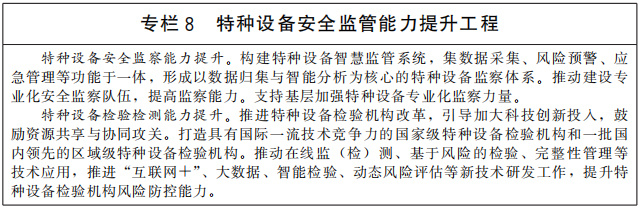 強化特種設(shè)備安全風險監(jiān)控體系建設(shè)。優(yōu)化特種設(shè)備監(jiān)管信息化建設(shè)基礎(chǔ)和應(yīng)用環(huán)境,推動國家與地方監(jiān)管數(shù)據(jù)互聯(lián)互通,增強數(shù)據(jù)分析和信用管理功能,完善全國統(tǒng)一的特種設(shè)備信息公示查詢系統(tǒng)。加強特種設(shè)備風險預警與應(yīng)急處置能力建設(shè),提高安全風險識別和防控能力。推動特種設(shè)備使用單位開展風險分級管控,從源頭上系統(tǒng)辨識風險、防控風險。完善生產(chǎn)單位、檢驗檢測機構(gòu)和人員資格信息等特種設(shè)備基礎(chǔ)數(shù)據(jù)庫。以電梯、氣瓶和移動式壓力容器、叉車等為重點,建立健全特種設(shè)備質(zhì)量安全管理追溯體系。推動特種設(shè)備生產(chǎn)企業(yè)加大研發(fā)投入,建立科學嚴密、反應(yīng)及時的風險防范系統(tǒng)。完善鍋爐安全、節(jié)能、環(huán)保三位一體的監(jiān)管體系,以實現(xiàn)碳達峰碳中和目標為導向,進一步提升鍋爐節(jié)能環(huán)保水平。