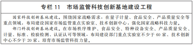 加強科技支撐體系建設(shè)。鼓勵市場監(jiān)管領(lǐng)域科研創(chuàng)新,加強市場監(jiān)管重點領(lǐng)域關(guān)鍵技術(shù)攻關(guān)和先進裝備研制,布局一批國家和部門科技創(chuàng)新基地。重點推進中國標準化研究院國家標準館建設(shè)工程和昌平實驗基地二期建設(shè)工程、中國計量科學研究院實驗基地二期建設(shè)工程、國家食品質(zhì)量安全檢(監(jiān))測能力建設(shè)工程、國家消費品質(zhì)量安全風險監(jiān)測預警能力建設(shè)工程等建設(shè),全面提升市場監(jiān)管科技支撐能力。
