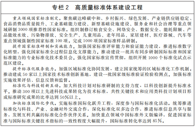深化標準化改革創(chuàng)新。加快標準供給由政府主導向政府與市場并重轉(zhuǎn)變,標準運用由產(chǎn)業(yè)與貿(mào)易為主向經(jīng)濟社會全域轉(zhuǎn)變,標準化工作由國內(nèi)驅(qū)動向國內(nèi)國際相互促進轉(zhuǎn)變,標準化發(fā)展由數(shù)量規(guī)模型向質(zhì)量效益型轉(zhuǎn)變。持續(xù)優(yōu)化政府頒布標準與市場自主制定標準協(xié)調(diào)配合的新型標準體系,推動一般性產(chǎn)品、服務(wù)標準由市場自主制定,建立健全政府頒布標準采信市場自主制定標準的機制。建立法規(guī)引用標準制度,強化法規(guī)與標準有效協(xié)調(diào)機制,運用標準支撐法規(guī)落地實施。加強標準化技術(shù)組織建設(shè),提升國家標準研制和實施能力。加強國家技術(shù)標準創(chuàng)新基地和國家級標準驗證檢驗檢測點建設(shè),提升標準化技術(shù)支撐水平。實施標準全生命周期閉環(huán)管理,完善標準實施信息反饋與評估制度,建立國家標準動態(tài)維護機制。開展對標達標專項行動,推動團體標準培優(yōu)計劃和企業(yè)標準領(lǐng)跑者制度實施,消除標準制定團體培育發(fā)展的政策障礙,釋放企業(yè)、社會團體標準化活力。