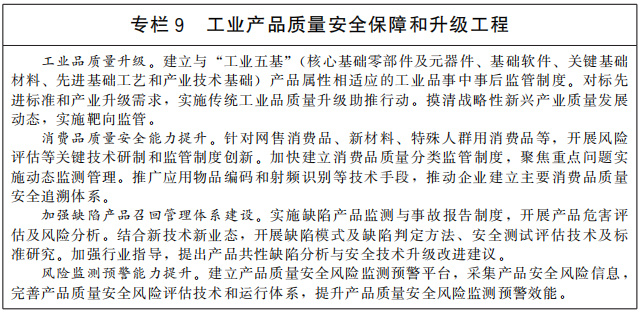 加大消費品安全監(jiān)管力度。推動企業(yè)建立主要消費品質(zhì)量安全追溯體系,記錄重點環(huán)節(jié)過程信息,實現(xiàn)產(chǎn)品質(zhì)量安全問題可追溯。健全缺陷產(chǎn)品召回制度,加強大中型客貨車、新能源汽車與智能網(wǎng)聯(lián)汽車、智能家居、兒童用品、電子電器等重點產(chǎn)品召回管理,強化重大案件調(diào)查與召回后續(xù)監(jiān)督工作,完善缺陷產(chǎn)品召回技術(shù)支撐體系。完善產(chǎn)品傷害監(jiān)測制度,拓寬監(jiān)測信息采集渠道,增加監(jiān)測點,推進產(chǎn)品傷害預防干預。完善產(chǎn)品質(zhì)量安全事故強制報告和調(diào)查處理制度,提高質(zhì)量安全事故人身傷害賠償標準。